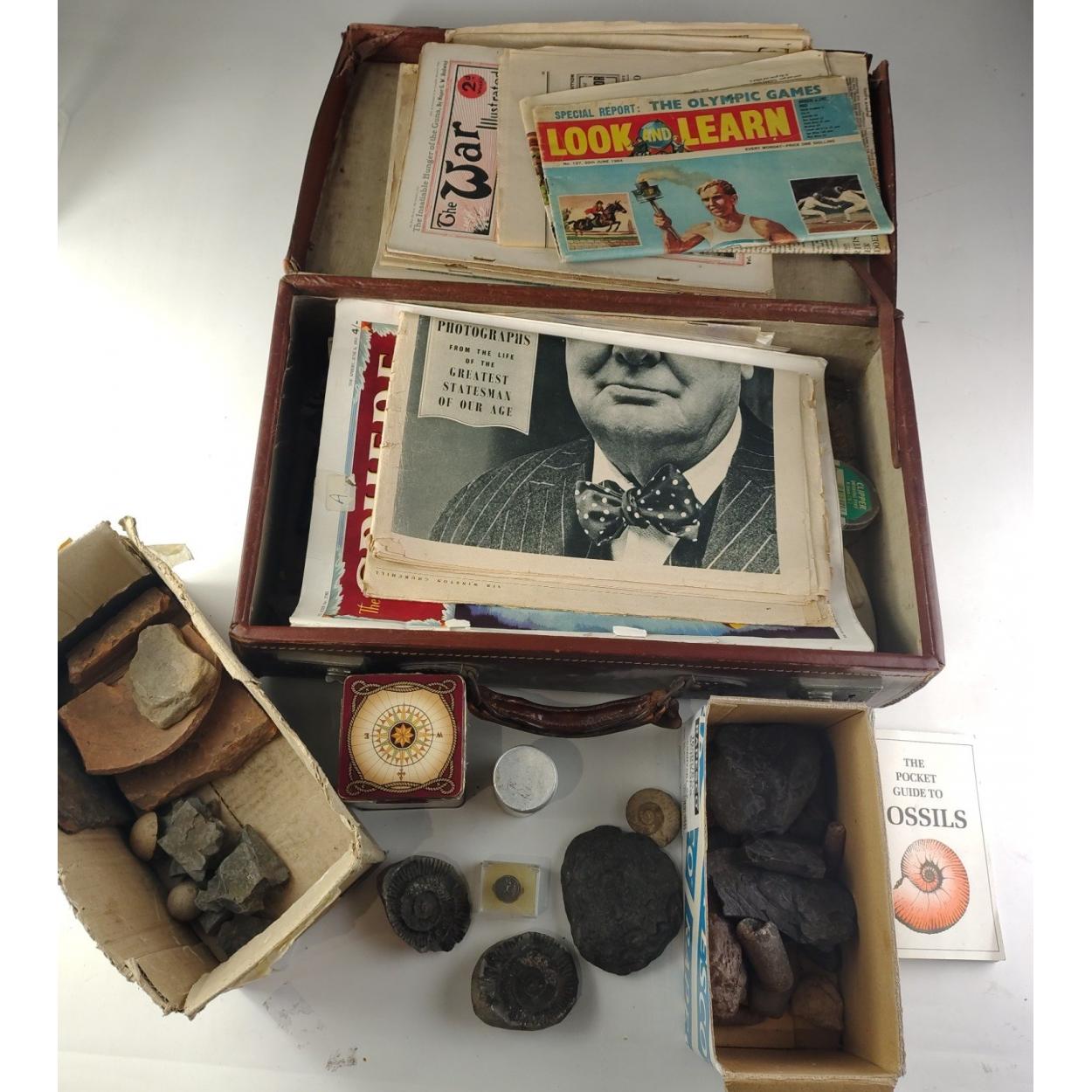 Peebles High School fund raising - a good collection of fossils and other interesting scientific ephemera plus a small vintage cardboard suitcase with more ephemera.