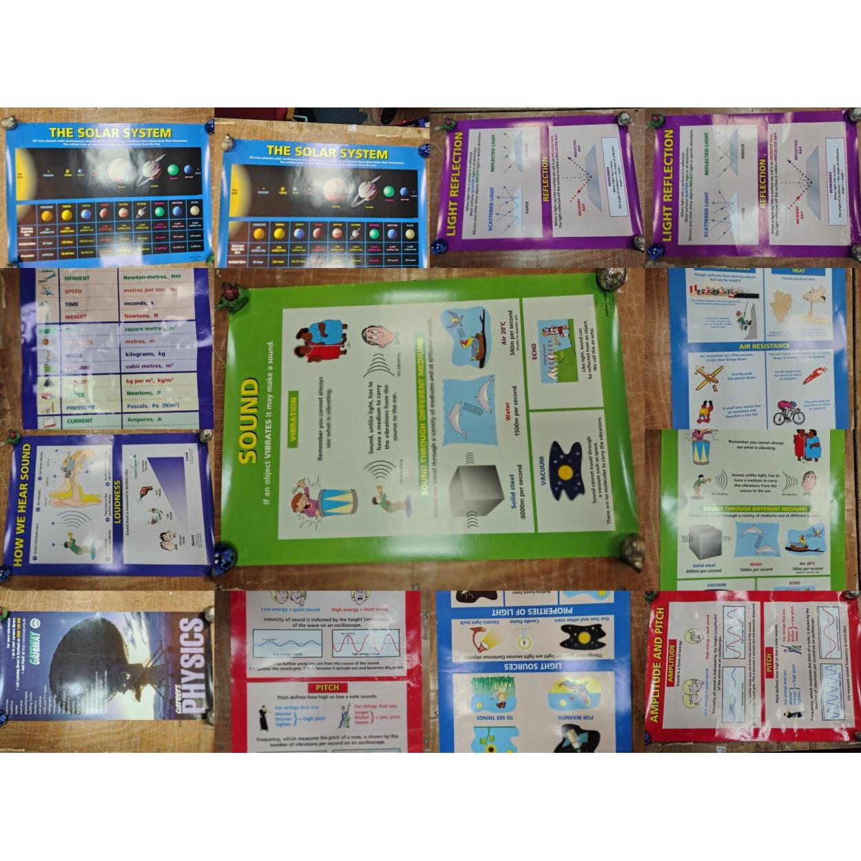Peebles High School fund raising - A good collection of 8 Science dept educational posters explaining Friction, Sound & Light etc - each poster 84cm x 60cm approx