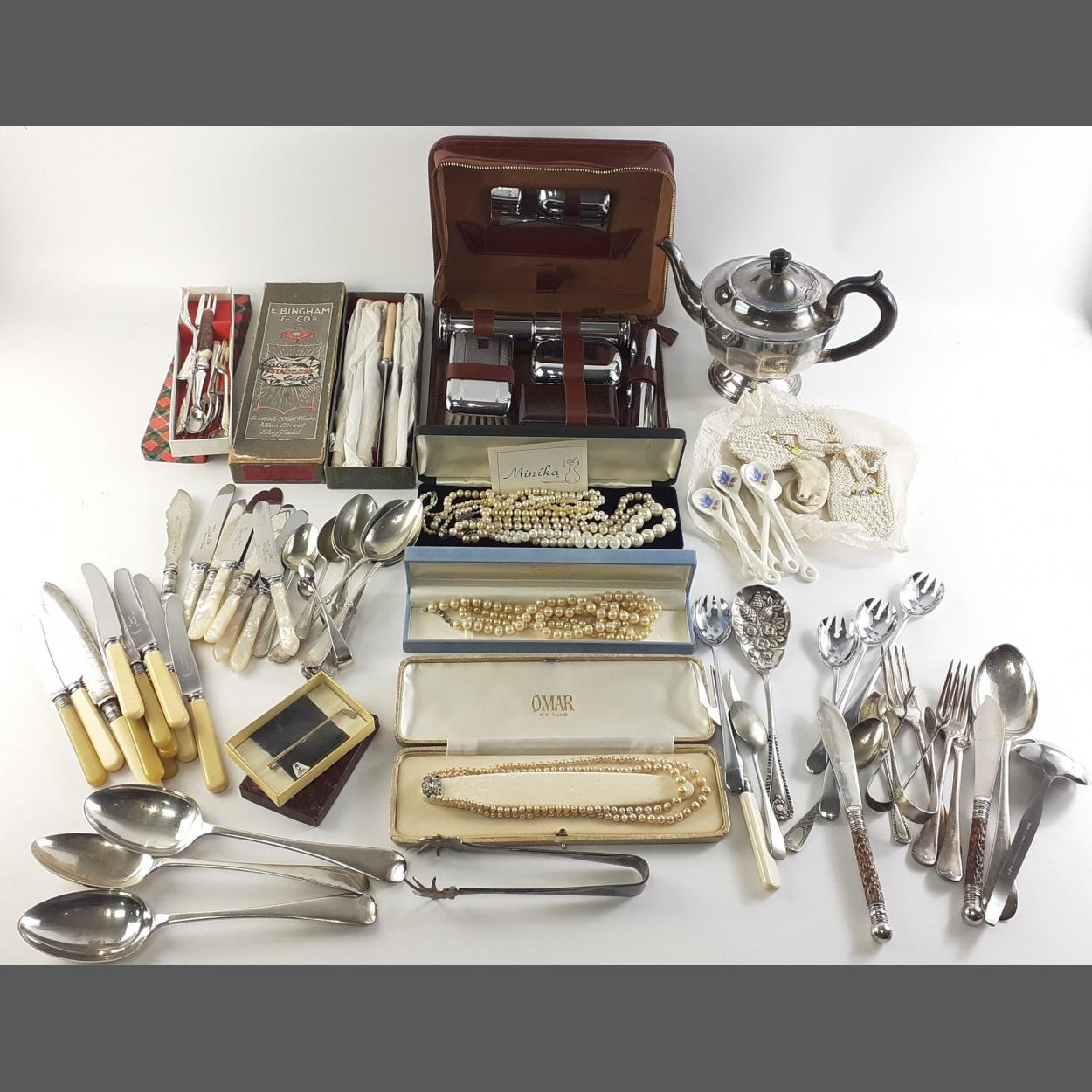 A great selection of boxed and loose EPNS quality silver plated items, teapot, knives, spoons etc. Includes other items such as gents travelling personal care set and some jewellery.