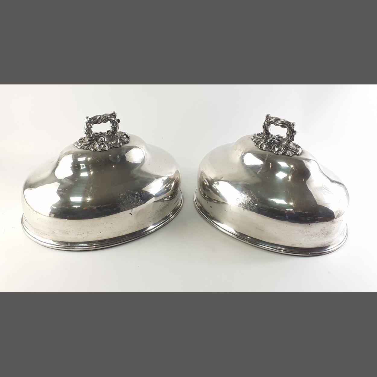 Two matching silver plated platter covers with inscribed family crest GANG WARILY. Each 36cm approx. Both in good condition.