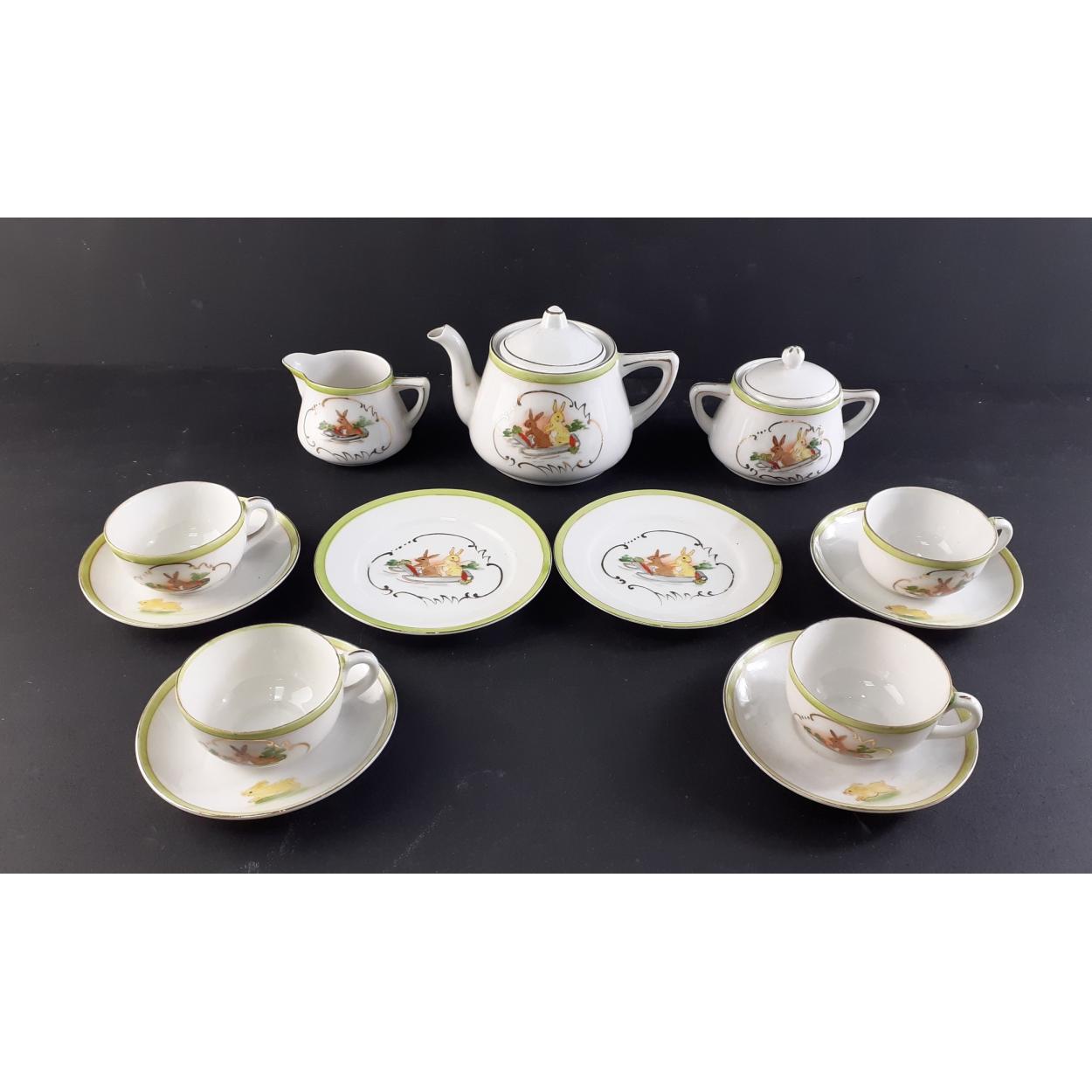A cutsie Japanese child's tea service set with bunnies. Four cups and saucers, teapots, sugar and cream with two side plates. In good condition.