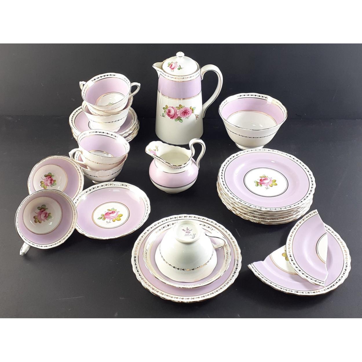 A NEW CHELSEA coffee set with lovely lilac and rose pattern comprising coffee pot, sugar and cream with six each side plates, cups and saucers. Note on side plate broken otherwise all in good condition.