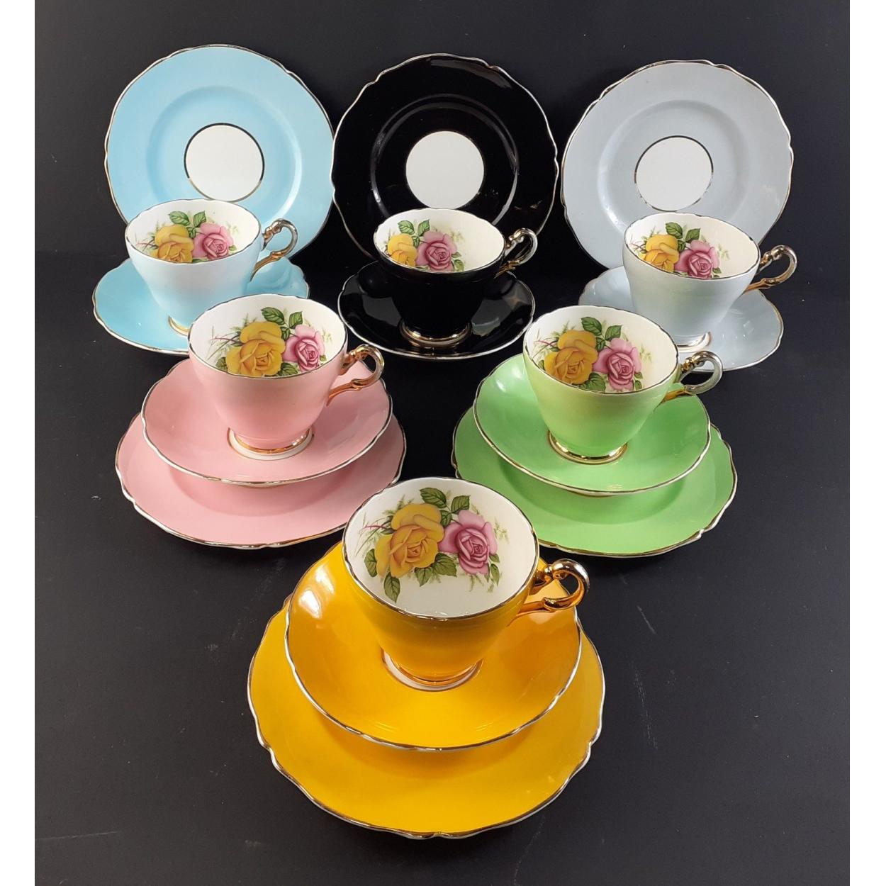 EDWARDIAN China. Exceptionally pretty tea cup, saucer and side plates harlequin style trios with roses in the cups. Gilded in 22kt gold. All pieces in very nice undamaged condition.