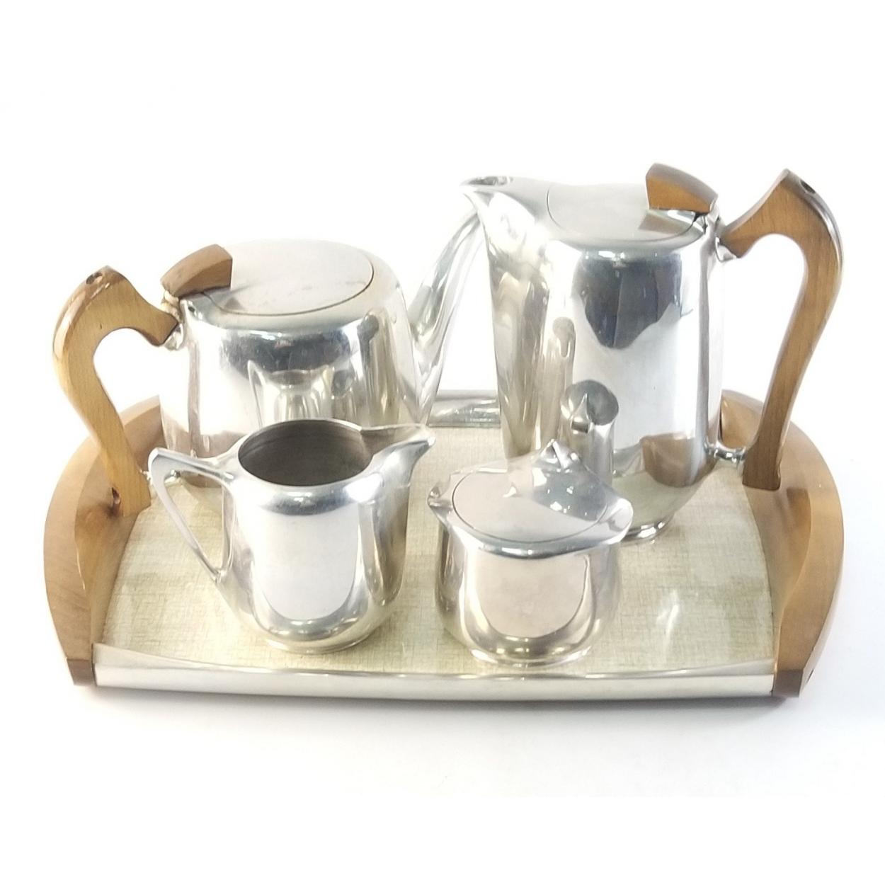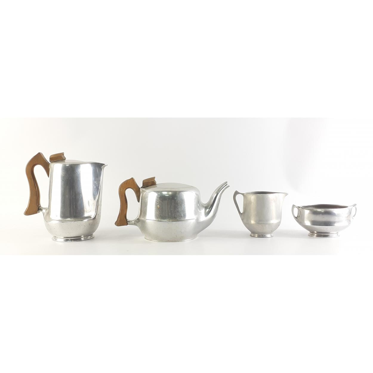 PICQUOT WARE tea set, comprising tea pot, water pot, milk and sugar and with tray. All in good condition.