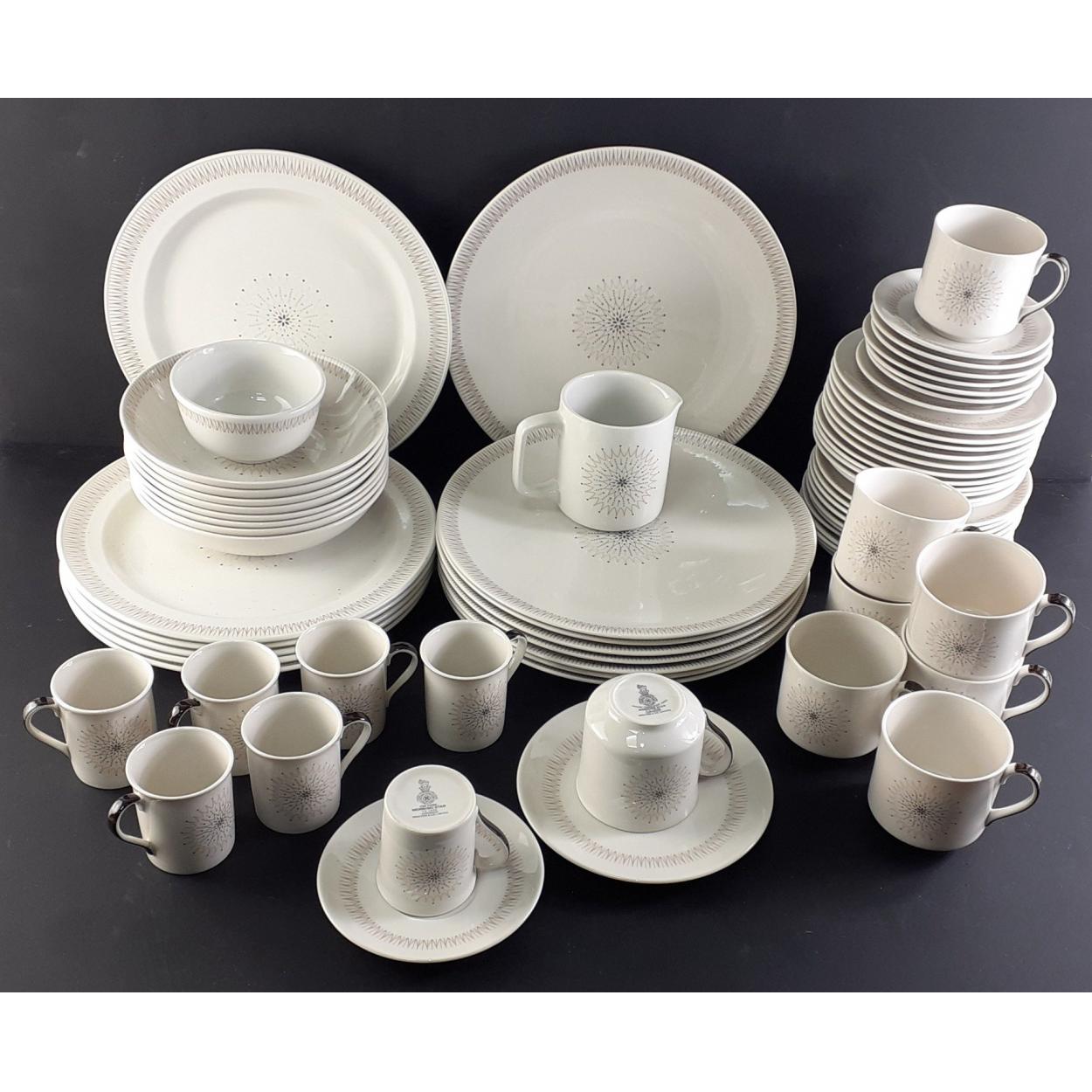 ROYAL DOULTON STEELITE ceramic large dinner service with additional coffee set in stylish MORNING STAR pattern. Comprises eight large platters, six plates, eight bowls, ten saucers with eight cups, side plates, coffee cups, saucers, sugar bowl and milk. All in good clean useable condition.