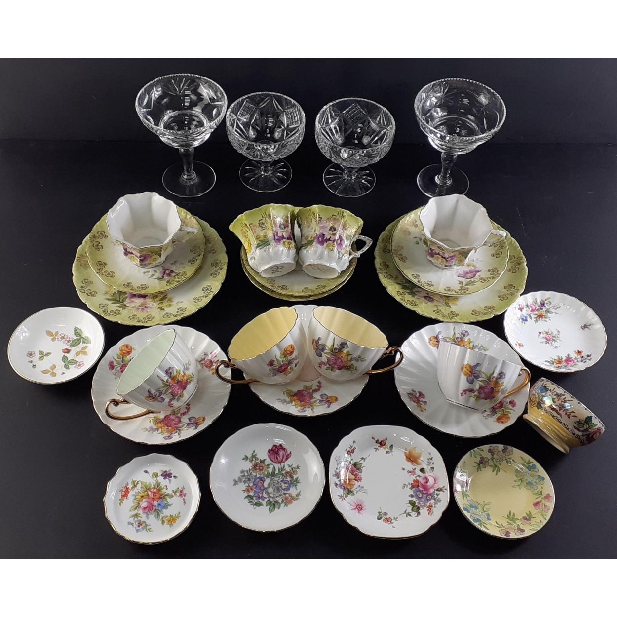 A mixed box of fine bone china to include some SHELLEY cups along with four crystal sundae glasses.