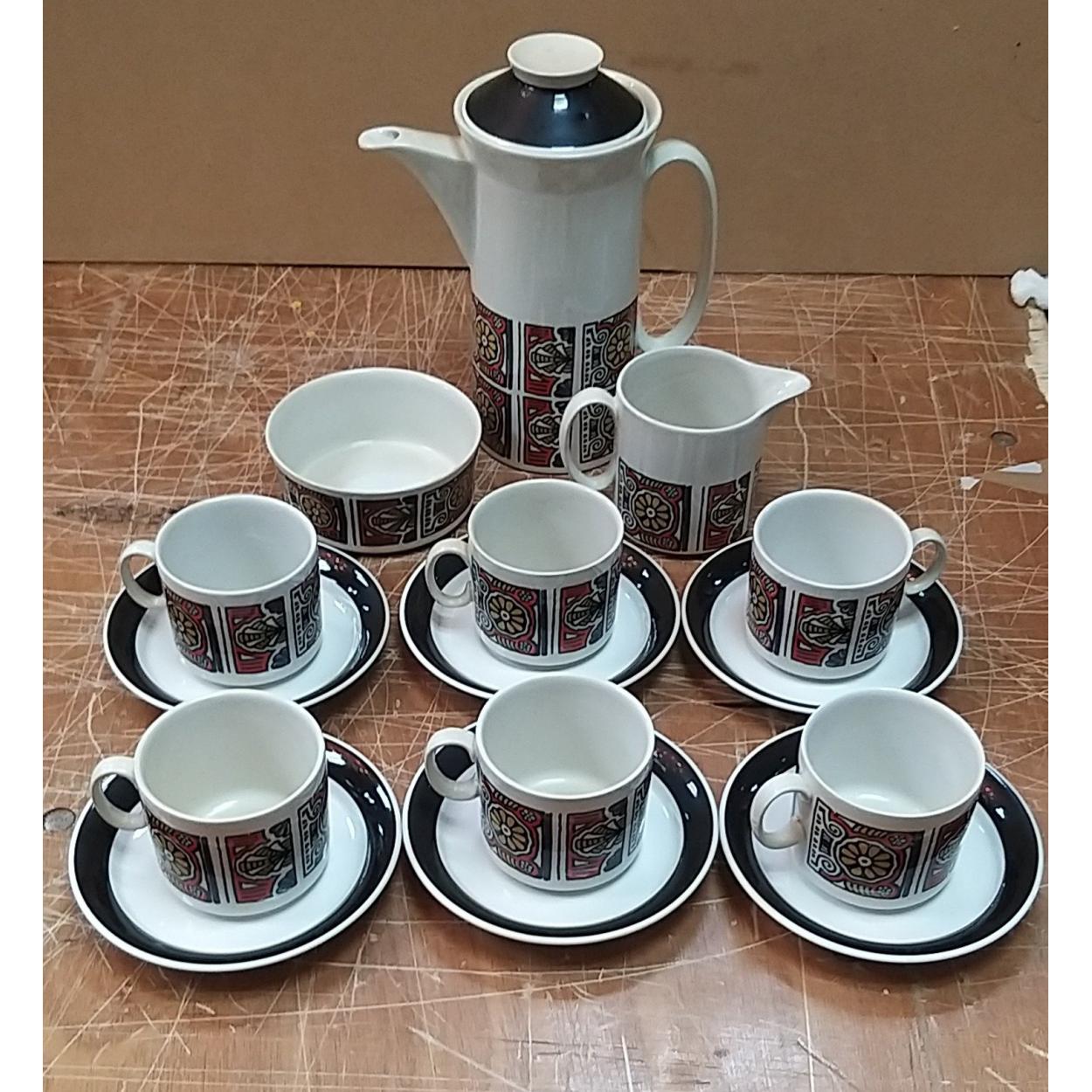 BURLEIGHWARE BURSLEM RETRO Amazon pattern coffee service with 6 cups, six saucers, and an elegant lidded coffee pot with cream and sugar - no signs of damage repair
