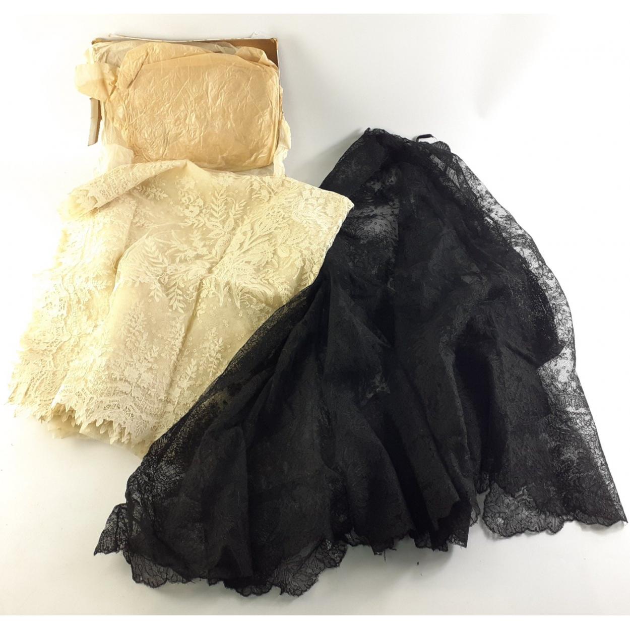 An antique BRUSSELS LACE wedding veil carefully preserved in tissue approx 36" long and 25" wide. Also a black mantilla.