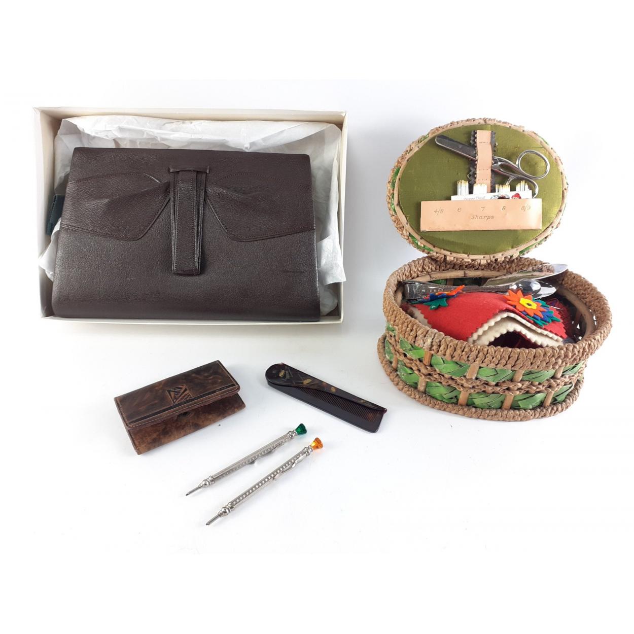 A cute small sewing box with contents, a vintage handbag, and a small purse with propelling pencils