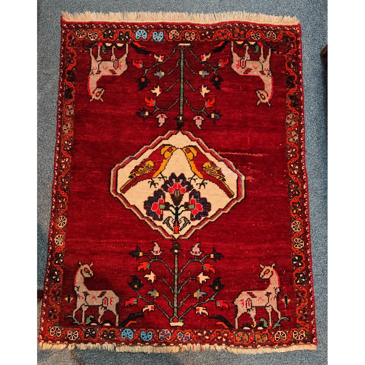 A KASHGAI Iranian hand made carpet 103cm x 80cm approx. Love bird in centre with deer in each corner. Generally good overall condition with some light wear.