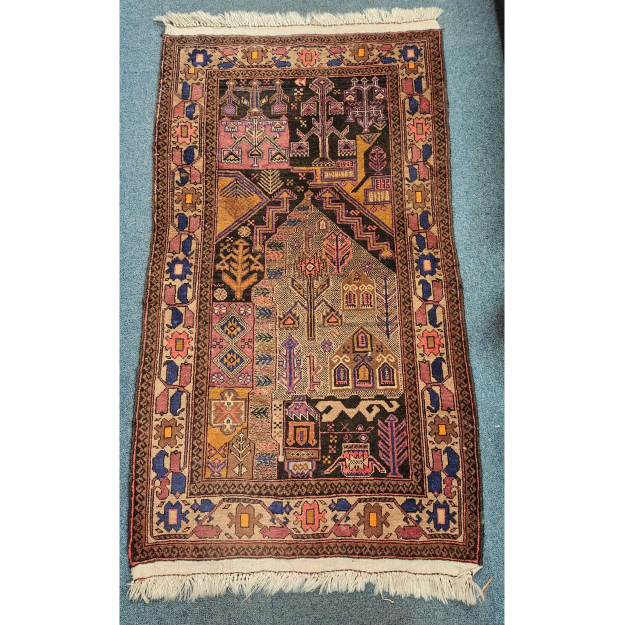 An antique hand made fringed pictorial carpet measuring 150cm x 85cm approx in muted colours and good useable condition.