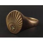 A substantial gents 9ct signet ring with small diamond chip and sunburst engraving, inscription in band. Size S, weight 5.9g approx