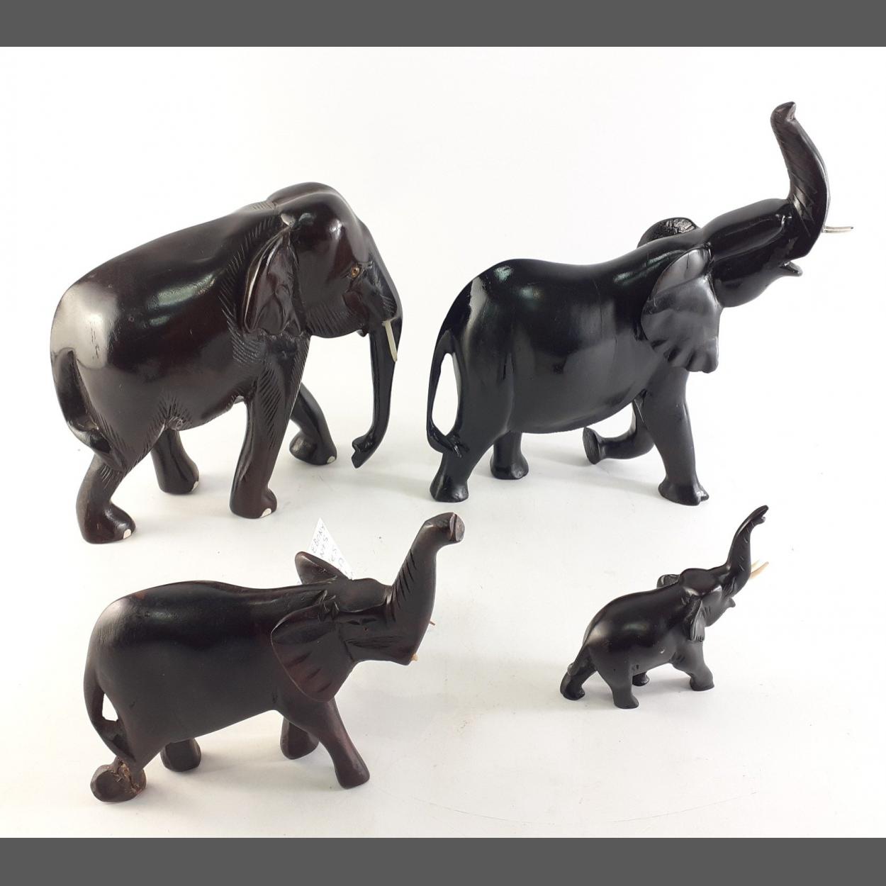 A set of four ebonised carved African Elephants. Nice group with some wear but displays well. Largest stands 28cm.