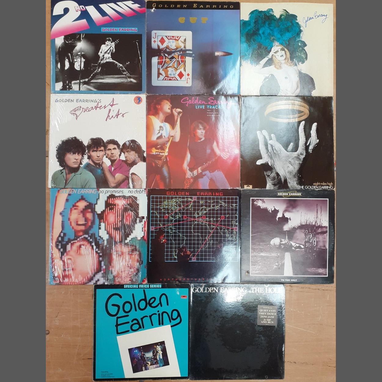 GOLDEN EARRING A collection of eleven Vinyl album records by the Dutch rock Band. Includes The Hole 12" Single, To the Hilt, Eight Miles High, Moontan, Northeastwestsouth, No promises No debts etc. Some light wear to covers.