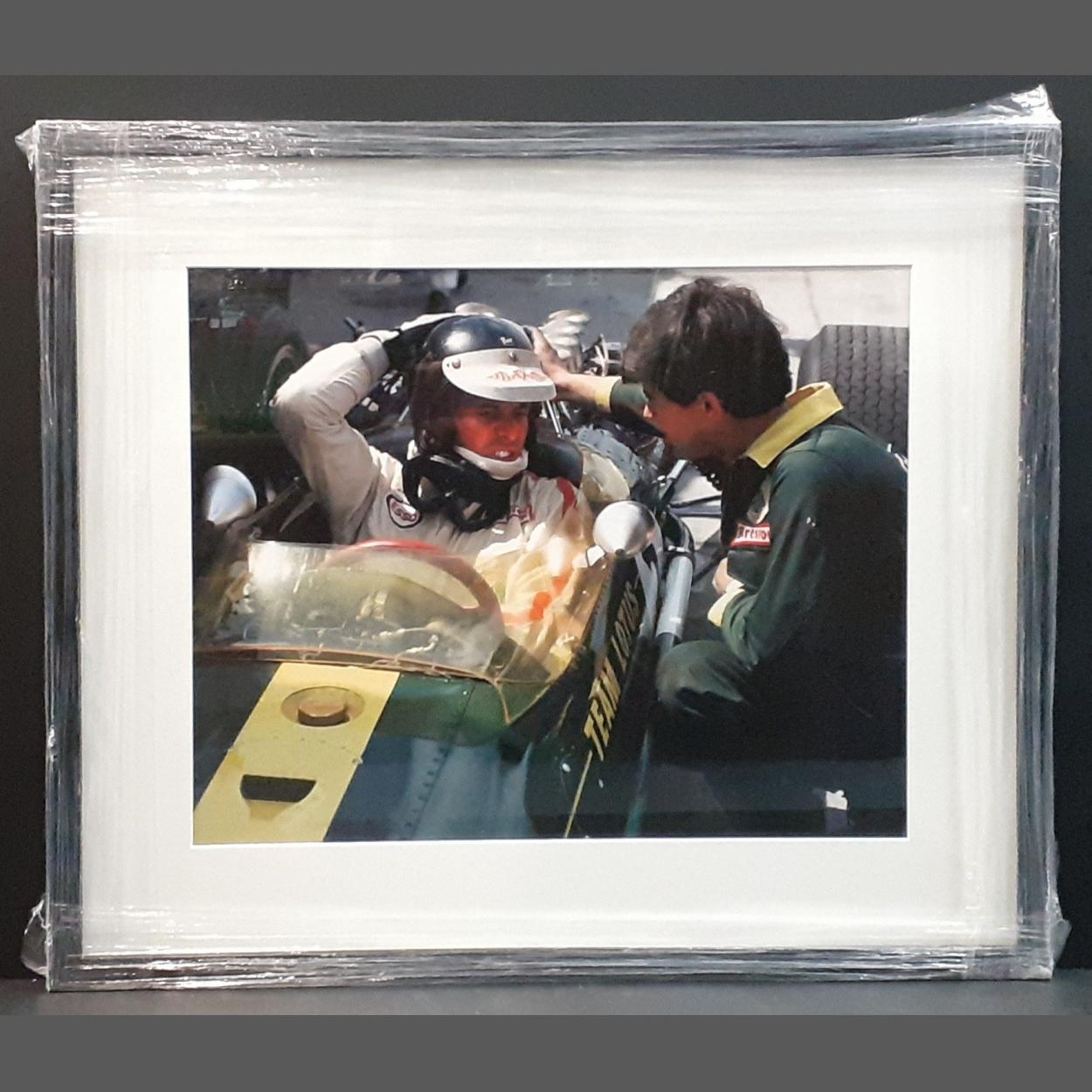 JIM CLARK Motor racing Interest Art print. A beautiful framed print of borders Legend and F1 World Champion JIM CLARK sitting in Team Lotus car in animated discussion with legendary mechanic Keith Duckworth. Printed on high quality heavyweight paper Frame size 69cm x 59cm. A stunning piece ready to hang.
