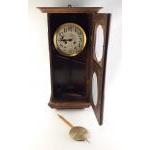 A large antique wooden wall clock A/F, nice piece but missing glass. With pendulum. Wear to case.