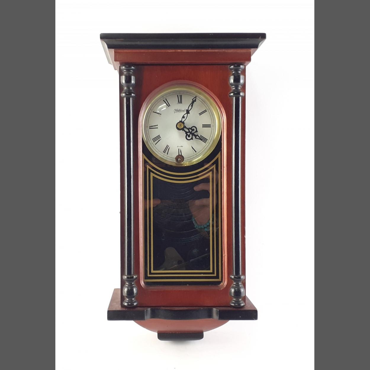 A pretty small size HIGHLAND wood cased wall clock. Winds well, a Smiths key is included.