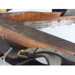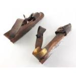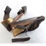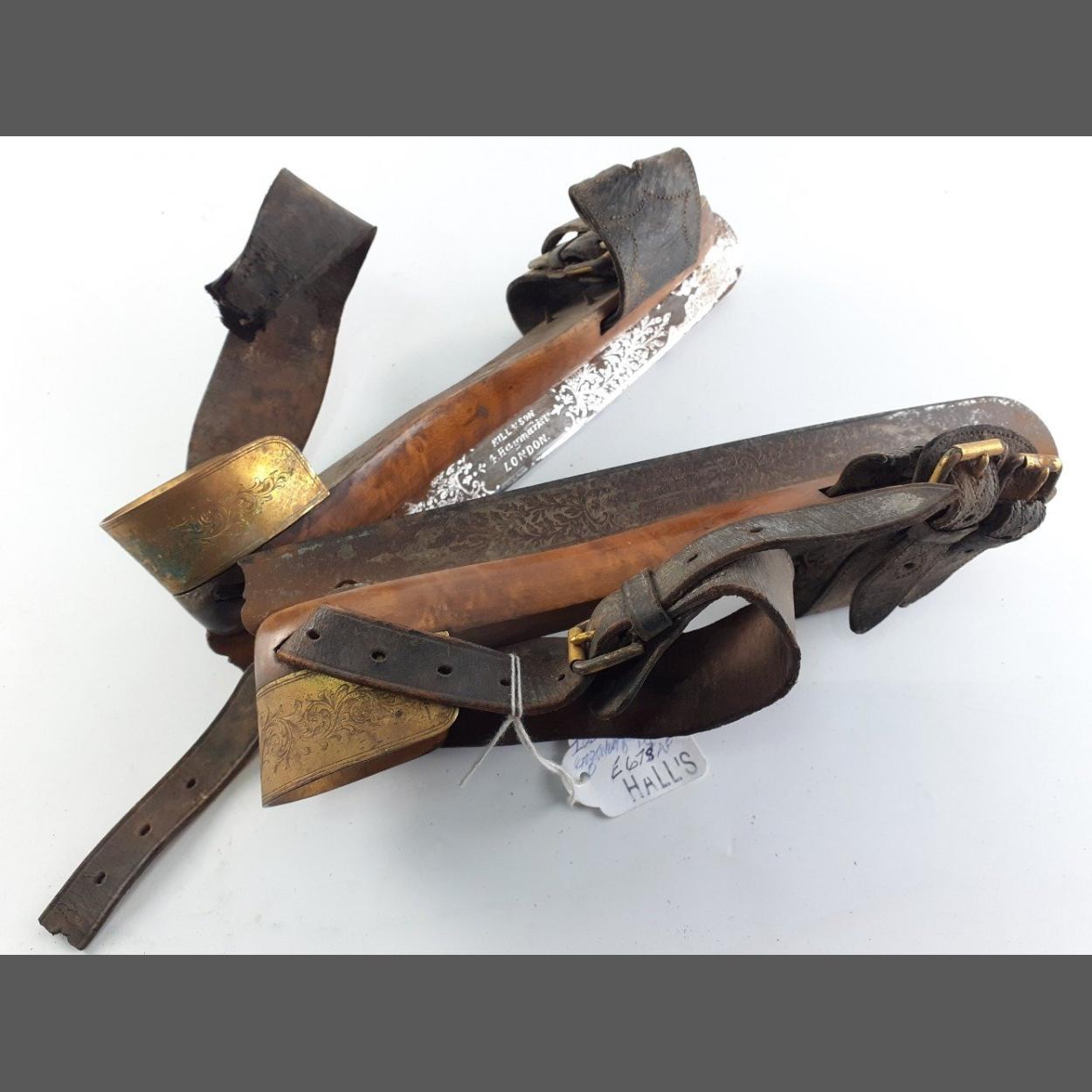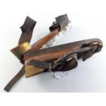 A pair of unusual antique ice skates with wood and brass fittings. The leather straps in poor condition.