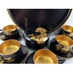 Super oriental lacquer papier-ware gilt tea service with lovely tray. Tray measures 30cm across approx. Six pretty cups and saucers with a pretty lidded sugar bowl. All in really nice condition.