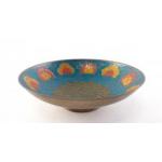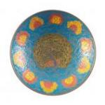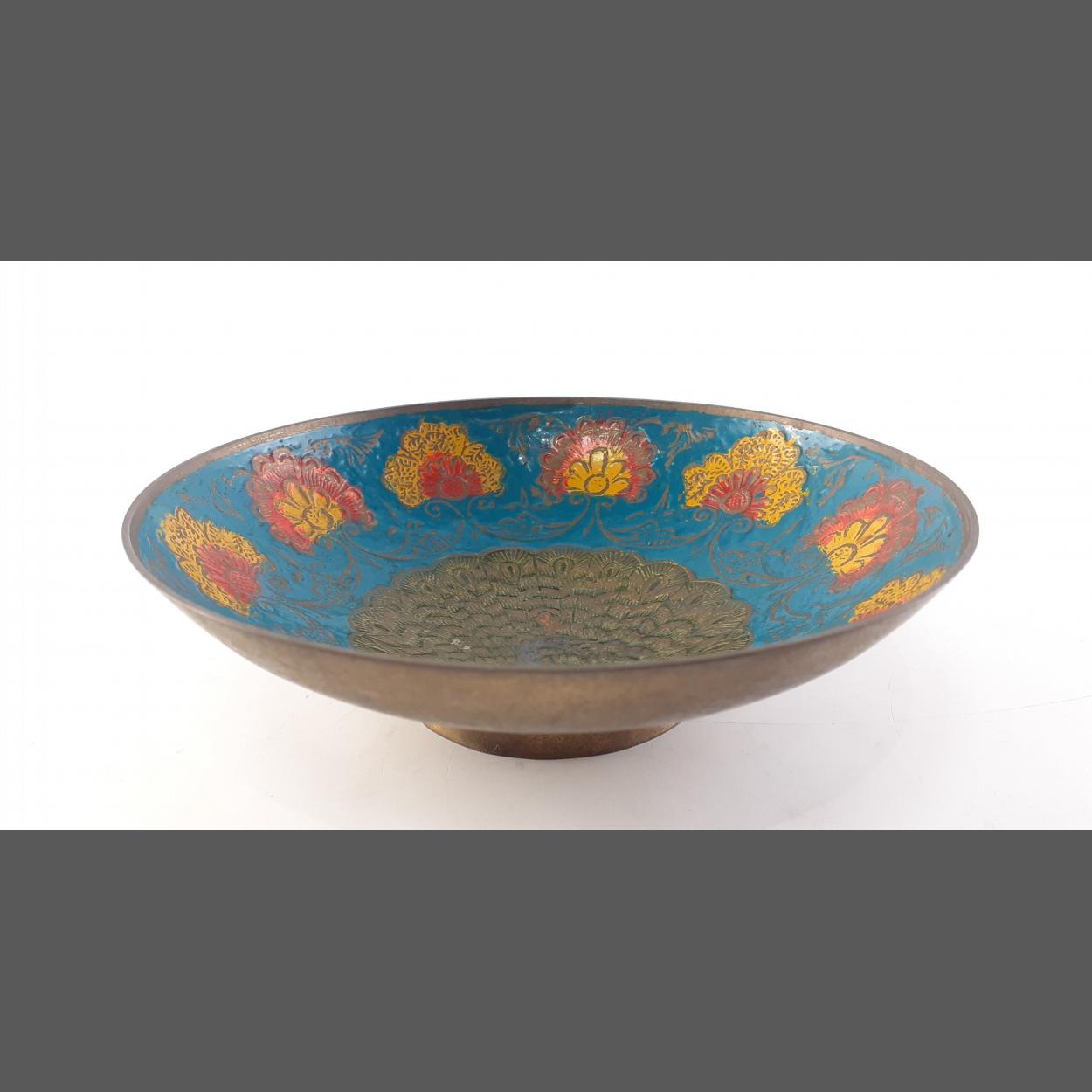 Oriental enamel style brass peacock dish with lovely colours. Approx 15cm diameter.
