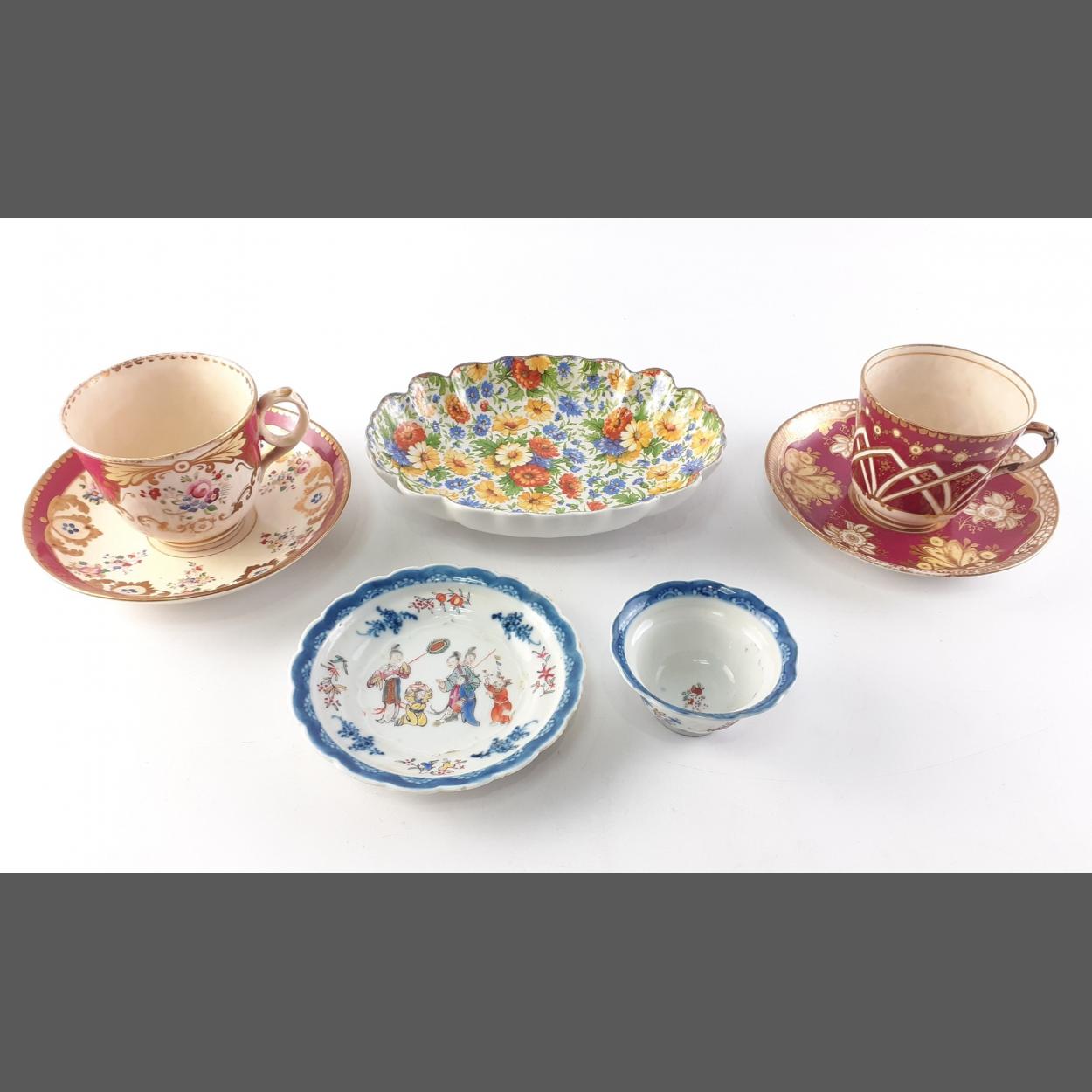A small collection of interesting cups and saucers, includes a oriental tea bowl and a bone china cup with an older rivertted repair. Interesting pieces.