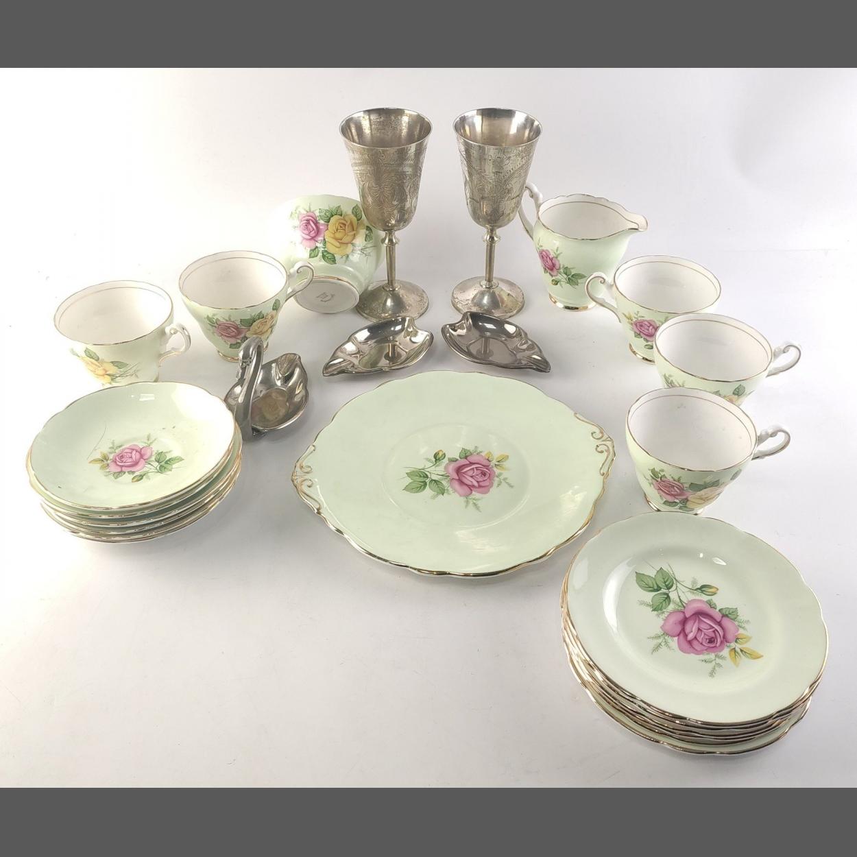 Part HARROWBY Bone China tea service, with 5 cups. In nice condition. Also two plated goblets.
