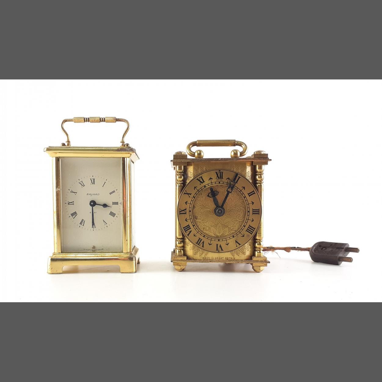 A SMITHS electric brass open faced carriage clock. in need of restoration but a pretty and unusual piece. Also one other Bayard presentation clock with Edinburgh Castle interest.