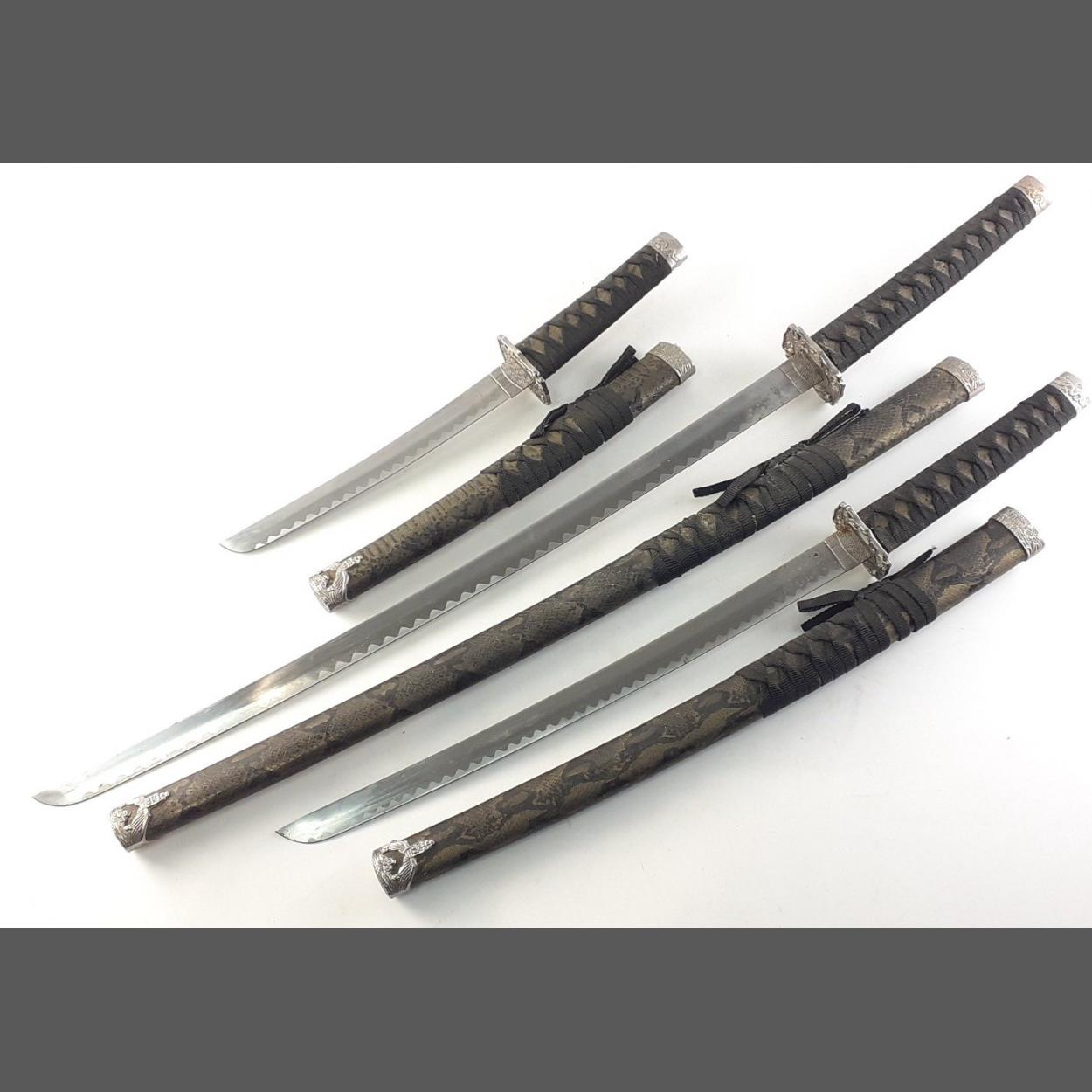 Three modern Japanese swords. Two Samurai swords with 68cm, 48cm and 28cm blades.
