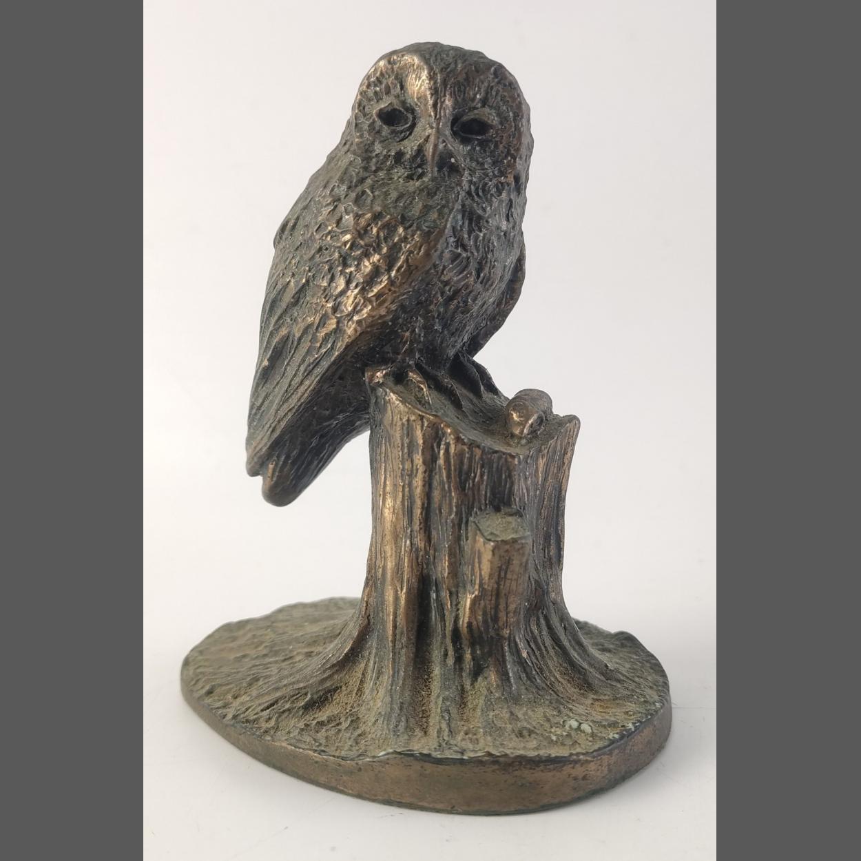A very nicely sculpted bronze of an Owl on a Log. Stands 10cm tall. Bronze Age, Made in England sticker on base.