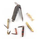 Small lot of five pocket and pen knives and a fish keyring.