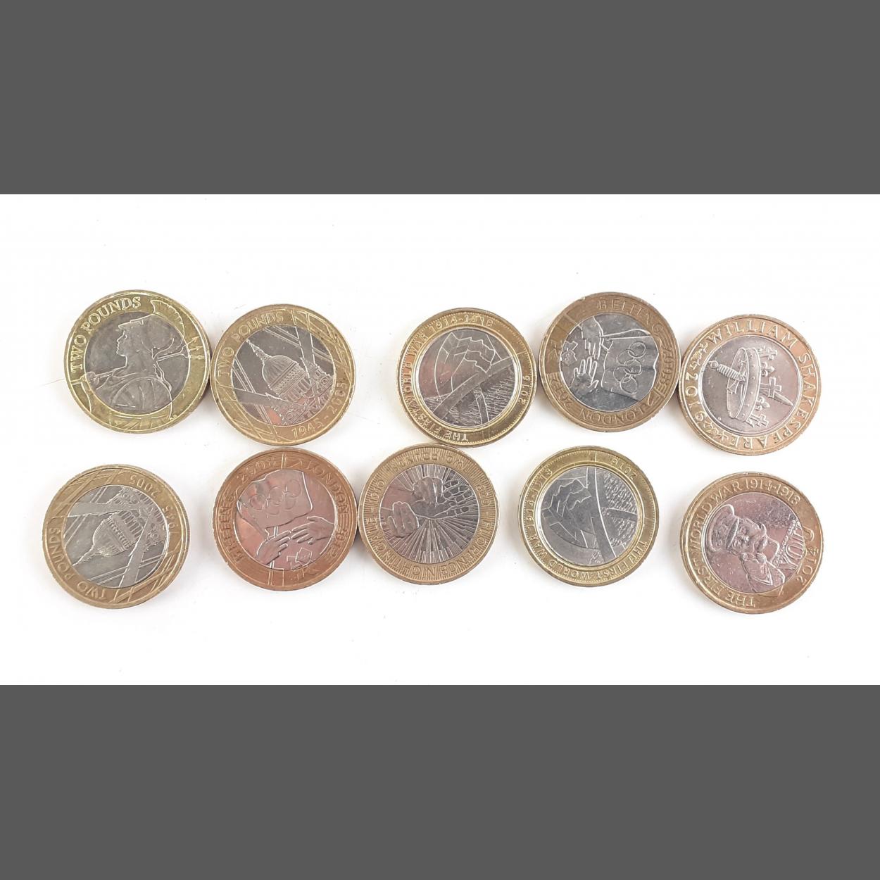 £2 Coins - 10 Collectible assorted varieties circulated. 2008 Olympics x2, Kitchener, St Pauls Blitz x2, Nightingale, Britannia, 2016 WWI x2