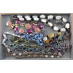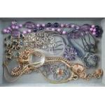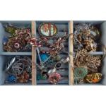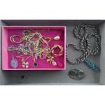 A useful four drawers desktop jewellery case with contents. Pretty necklaces, pendants, chains, brooches and much gilt bling!
