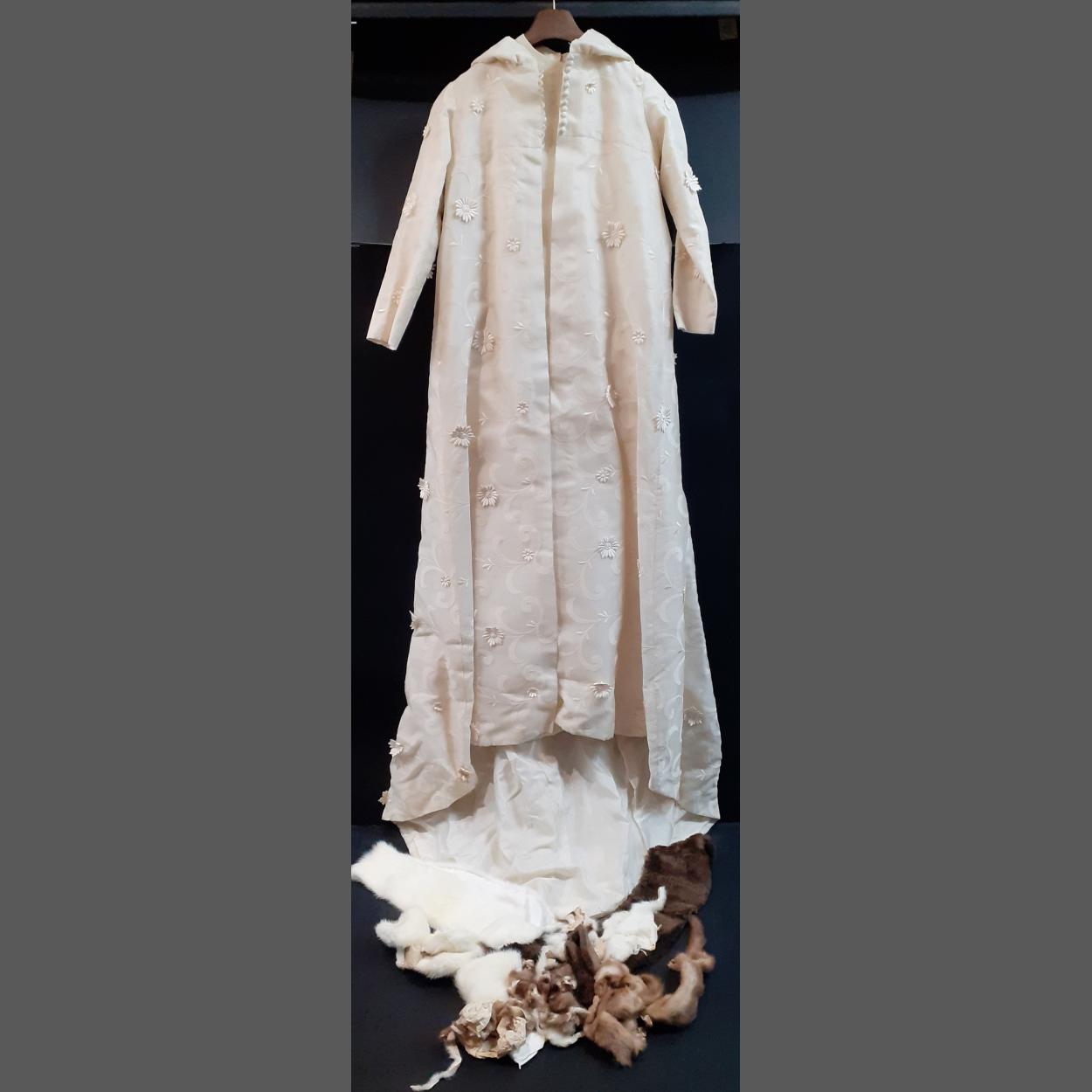 Impressive antique ivory coloured hooded long wedding dress. A beautiful piece appears to have been well stored. Comes with fur stoles.
