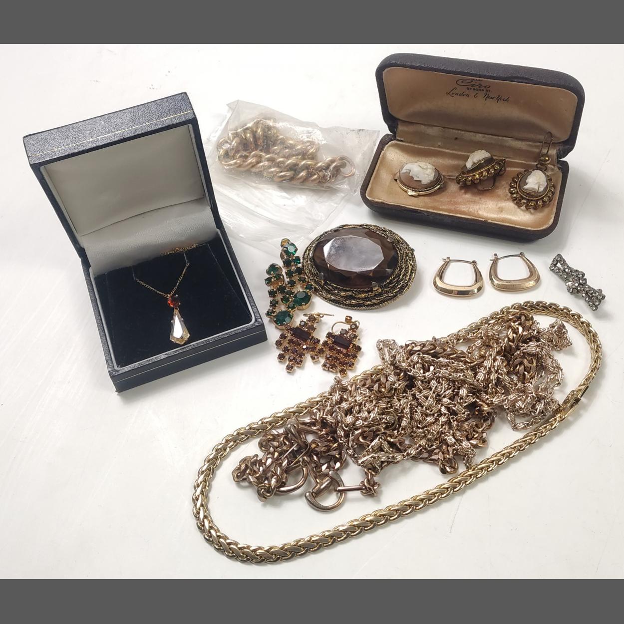 A great collection of antique and gilt bling jewellery, Chains rolled gold etc. Hefty chains, earrings, brooches and a lovely wee old pinchbeck Cameo set.