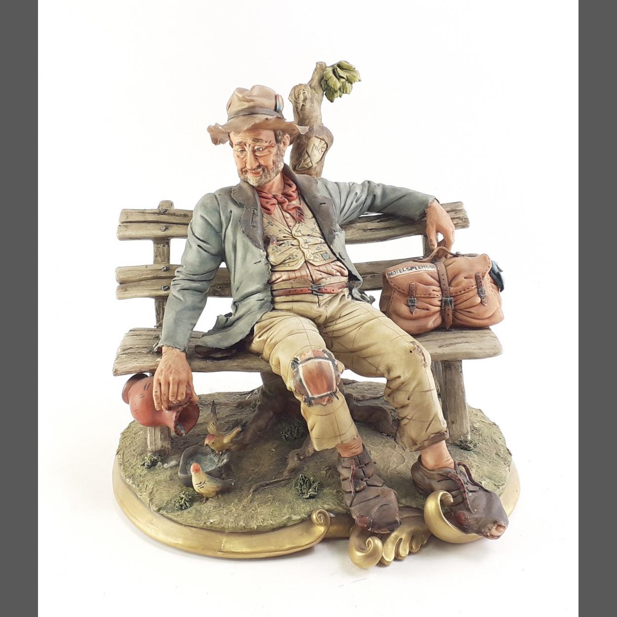 CAPO DI MONTE figure of a humorous Tramp on a bench. Stands 25cm tall. Minor damage noted to extremities on hat.