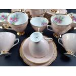 CLARE Bone China blush pink tea service in lovely condition. Comprising Two serving plates, 12 saucers and twelve side plates with eleven cups and two each of sugar and cream. In very good clean condition with no chips or cracks and unrubbed gilt.