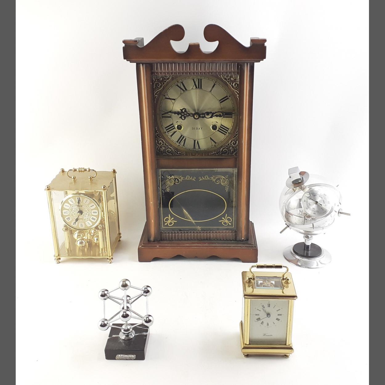 A 31 day wall clock, two carriage clocks (one Quartz), a Hygro barometer etc. Mixed lot.