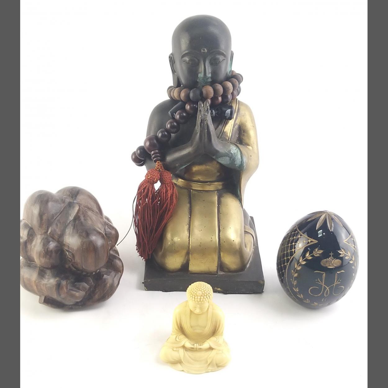 A kneeling Buddah, a small bone Buddah, a carved wooden shy man and a modern replica Faberge egg. four interesting pieces. The largest 24cm tall.