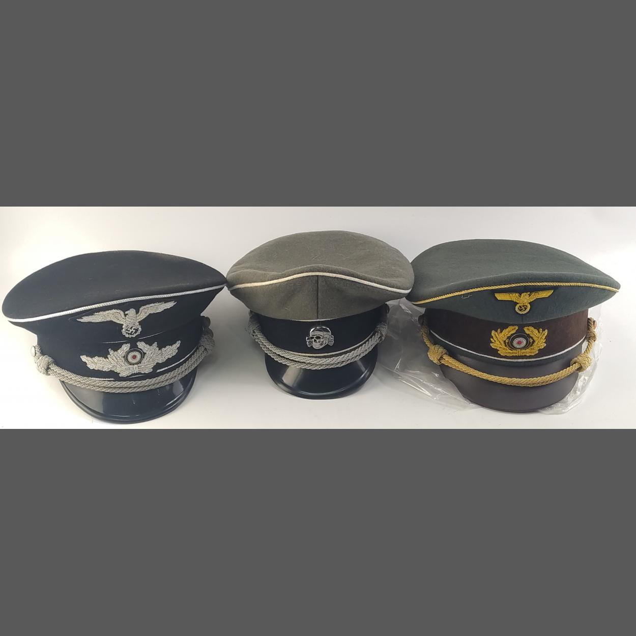 A collection of three great quality reproduction WWII German military Caps with insignia.