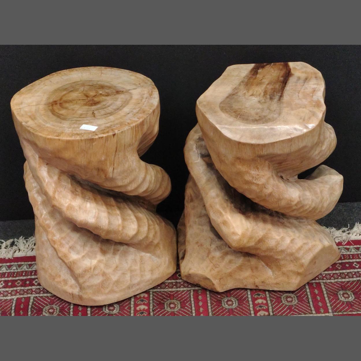 A pair of solid wood hand carved side tables each 50cm tall. Lovely pair in good clean condition.