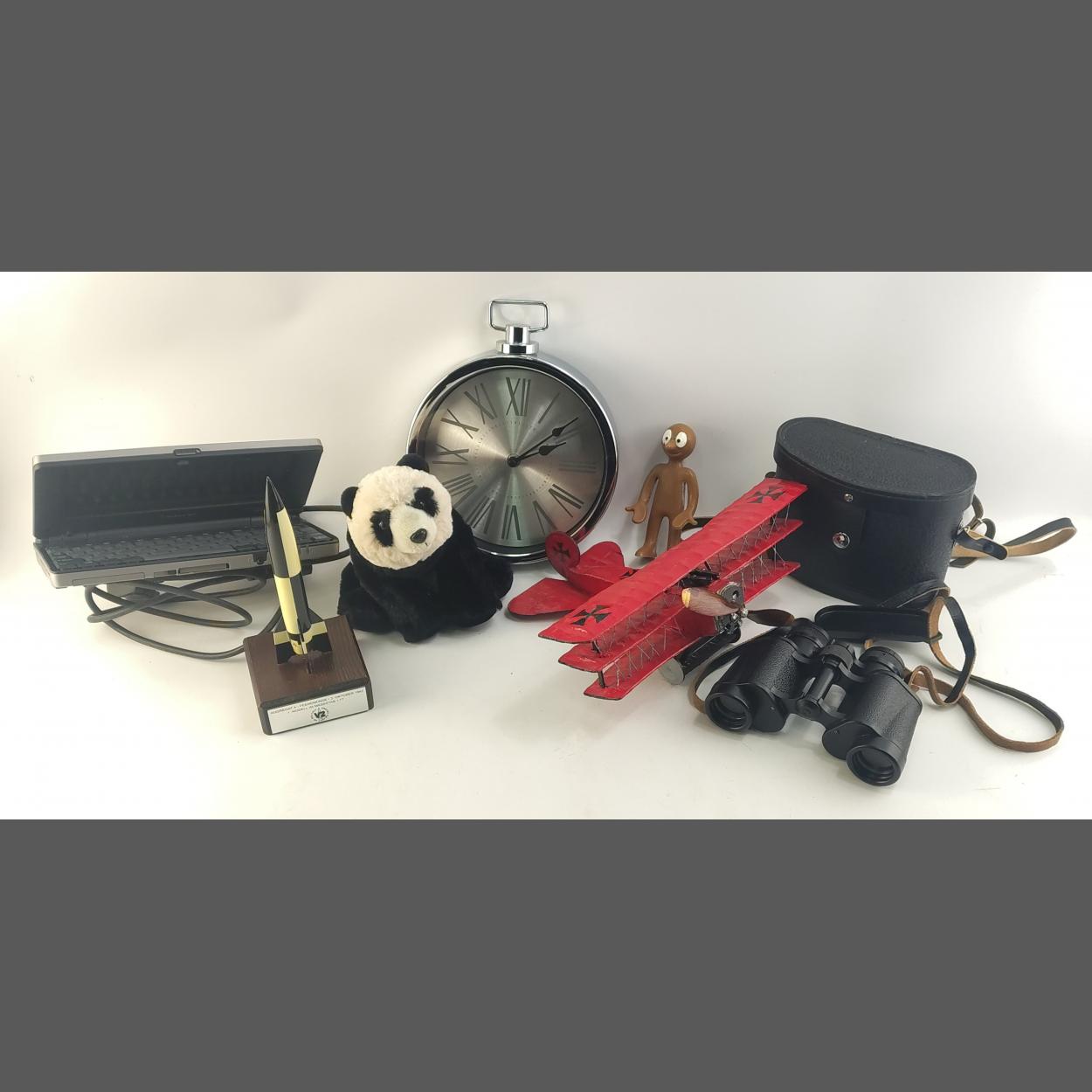 A mixed lot. Fokker model, Clock, Binoculars, Panda cuddly toy, untested small laptop etc.