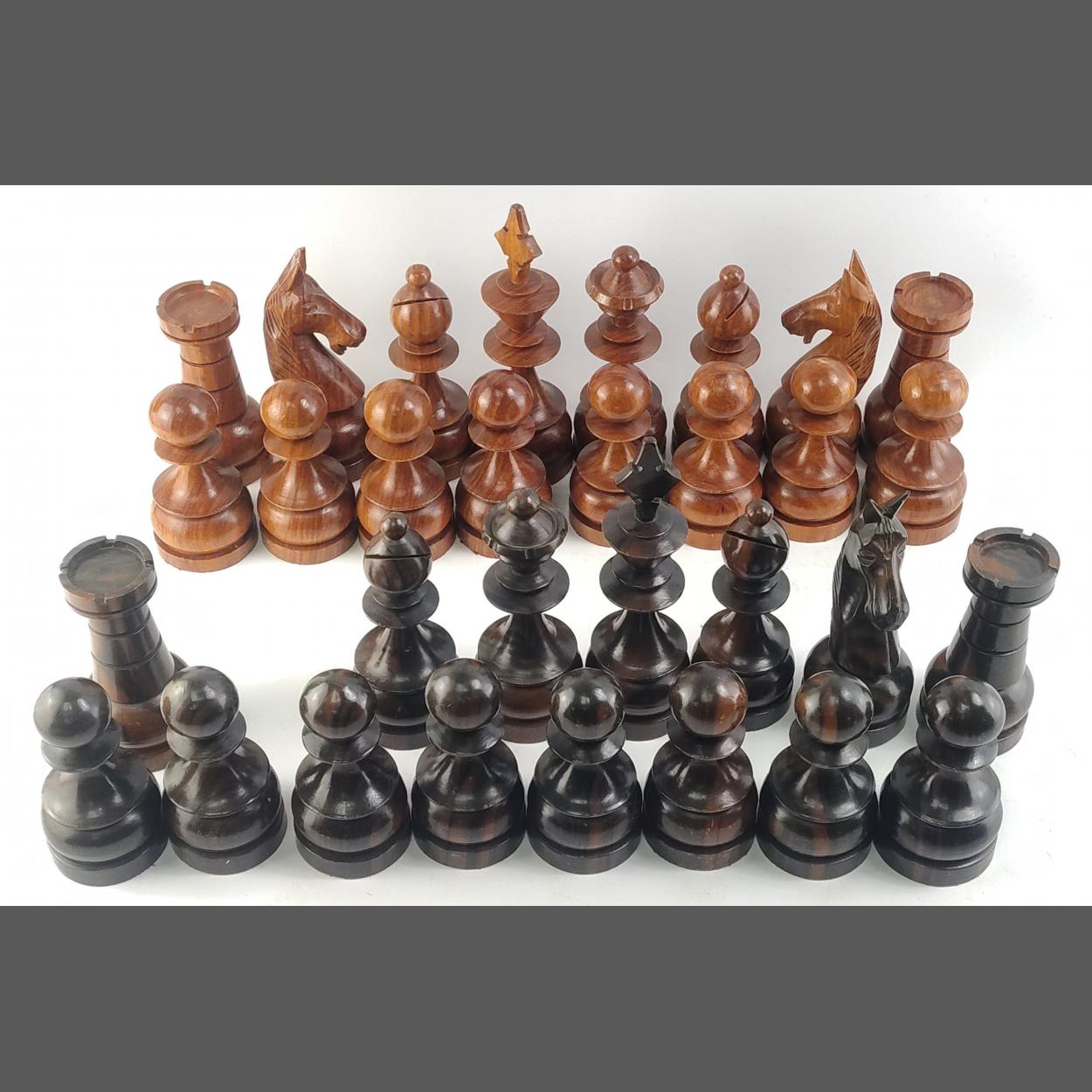 A large wooden chess set Kings stand 19cm tall. missing one black Knight.