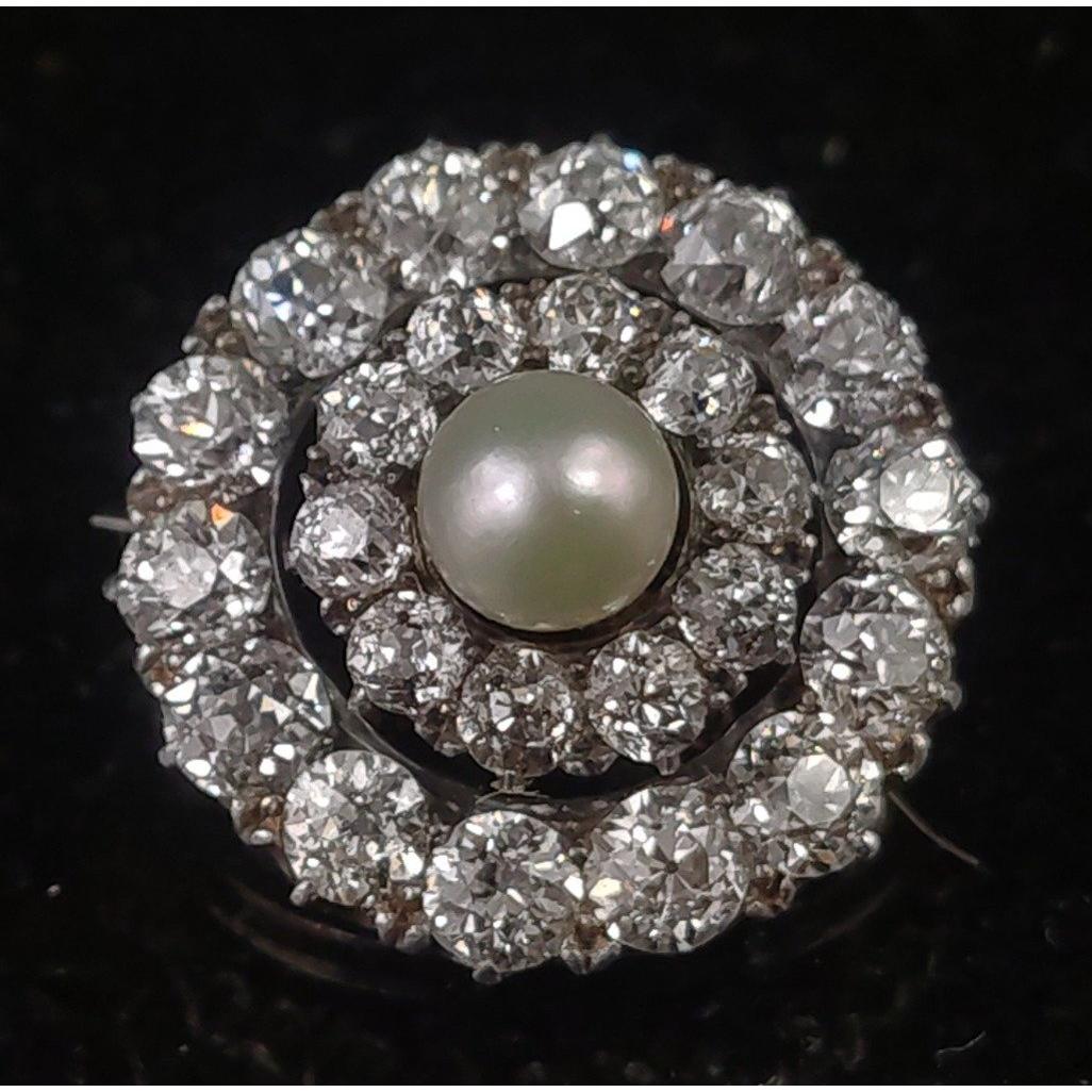 Vintage diamond Brooch set with 24 stunning diamonds and a center pearl. The brooch measures 20mm. The larger outer ring stones measure approx. 3.3mm and the inner stones 2.6mm. Total gross weight is 5g. All stones appear clean and bright and free from chips or cracks. A truly stunning jewel !