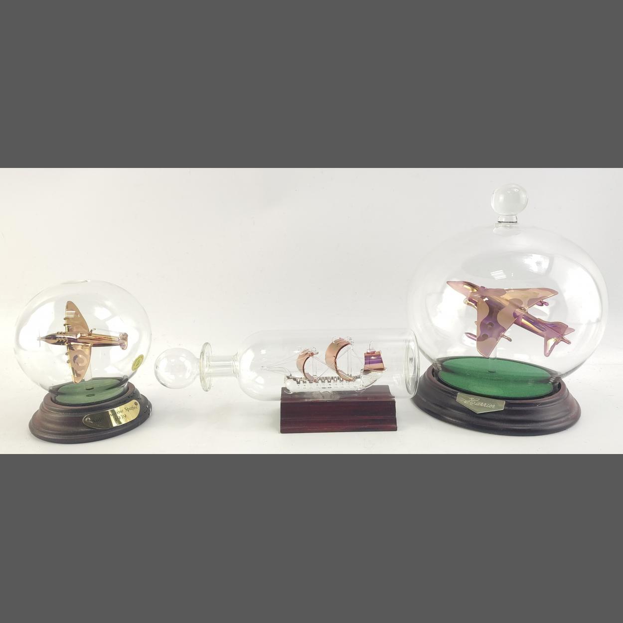 Three pretty glass models in domes. An RAF Harrier plane, A Spitfire and a boat.