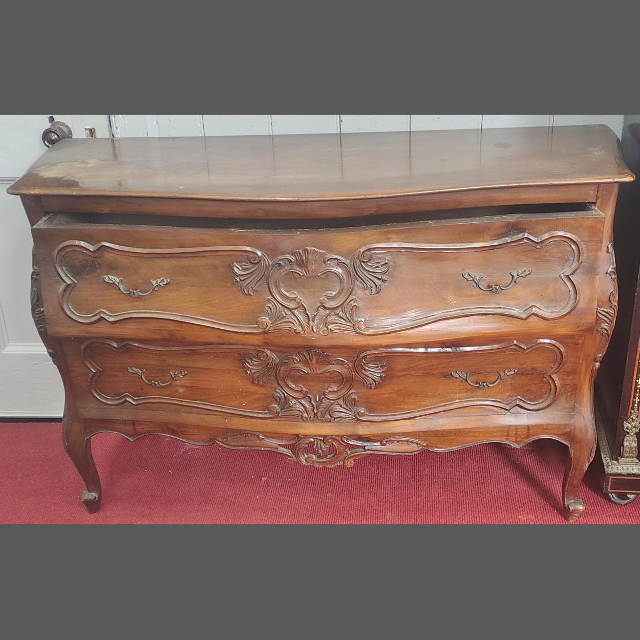 A two drawer bow front chest of drawers with lovely scroll work detail. Came from a substantial property in Italy. 125cm x 45cm x 84cm