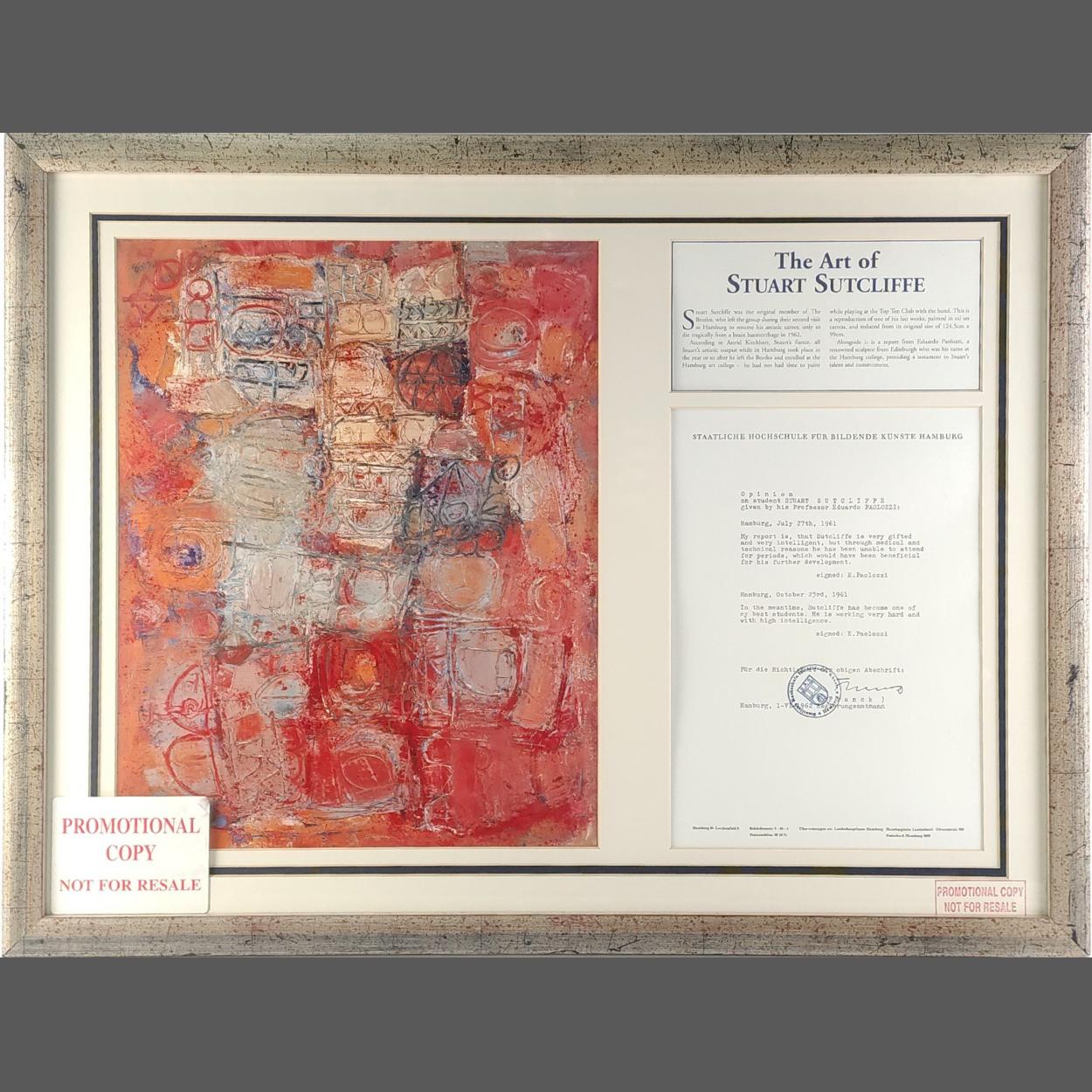 STUART SUTCLIFFE framed promotional print with certificate. A full production sample. Frame measures 71cm x 54cm. A superbly well presented piece, professionally framed with a copy letter by E. Paolozzi giving his opinion on Sutcliffes work. Interesting pieces of early Beatle related memorabilia