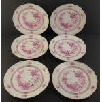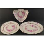 HEREND OF HUNGARY part porcelain dinner service in INDIAN BASKET raspberry coloured pattern. Comprising 37cm platter, 30cm serving plate, triangular serving dish and six dinner plates and five shallow bowls. One of the dinner plates has a historical crack. A beautiful service, in good useable condition.