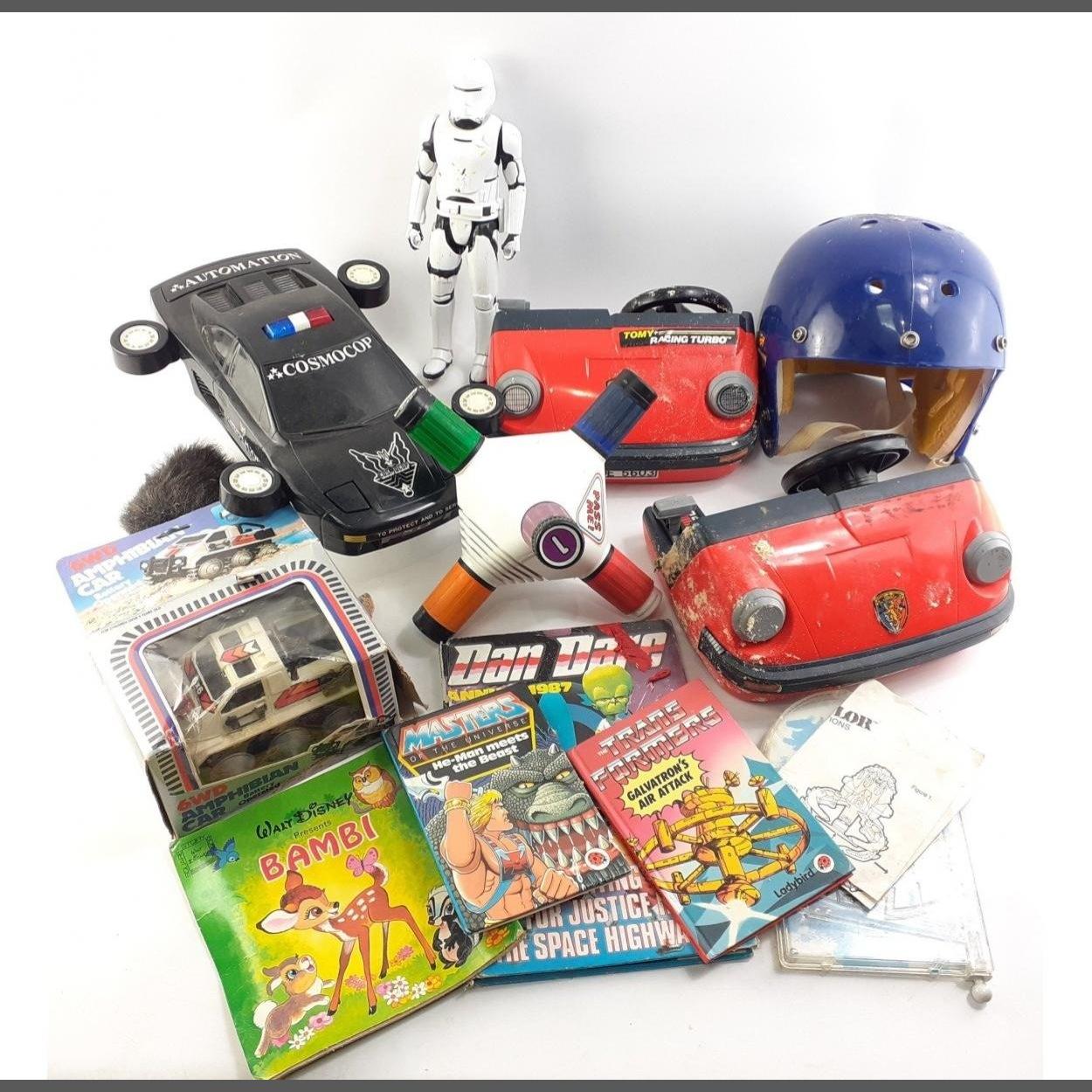 A box of assorted play worn vintage toys. COSMOCOP, Amphibian Car and much more.
