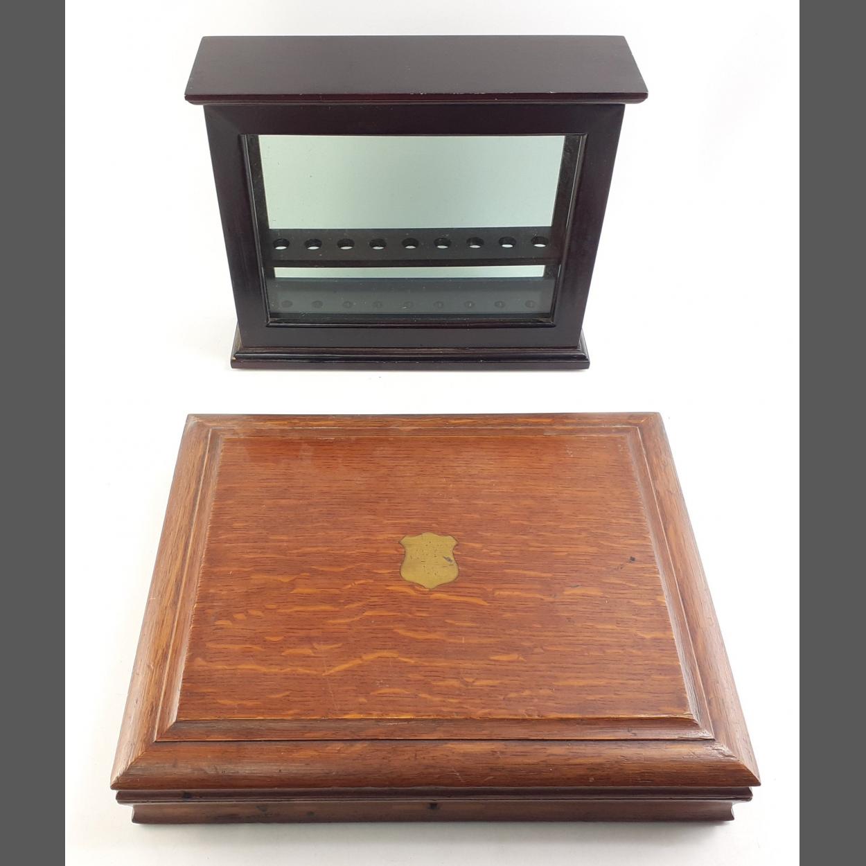 Two handy boxes. One glass fronted slides up wih holes for storage, possibly pipes or scientific. The other an old cutlery box.