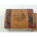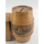 Three Mauchline Ware money boxes, one barrell shaped.